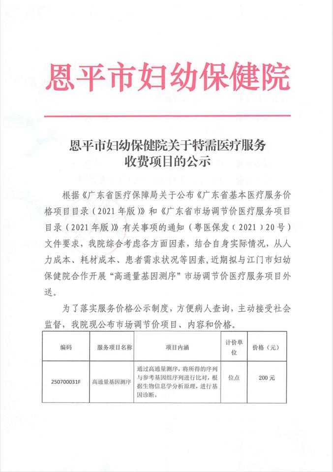 恩平市妇幼保健院关于特需医疗服务收费项目的公示