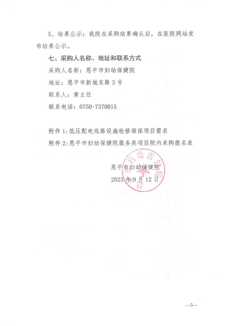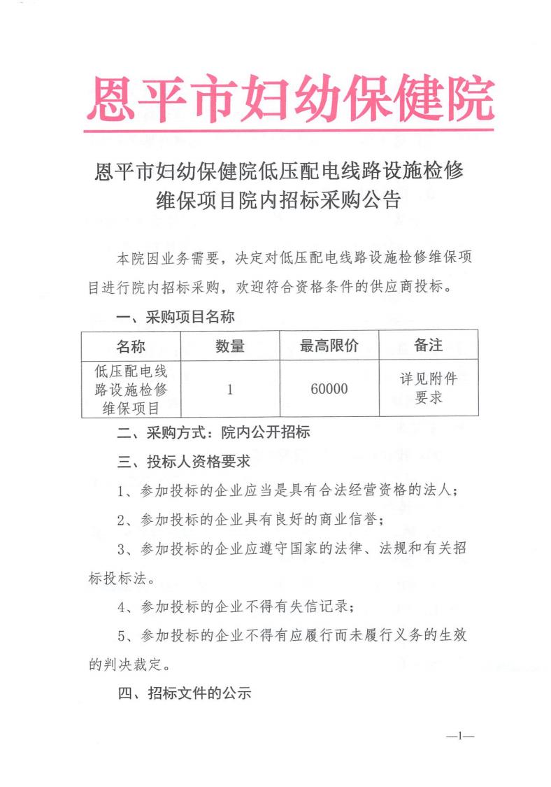 恩平市妇幼保健院低压配电线路设施检修维保项目院内招标采购公告