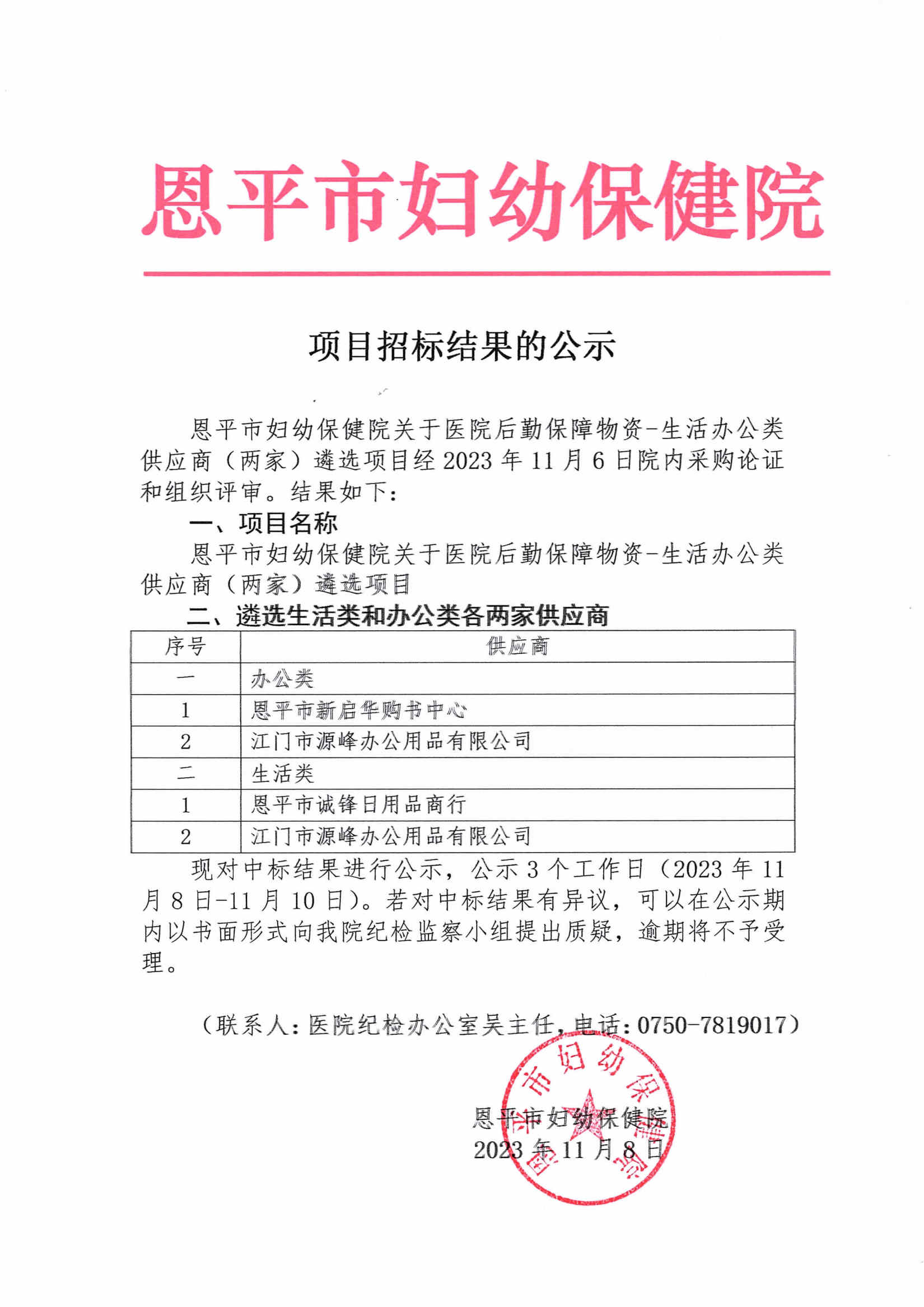 恩平市妇幼保健院关于医院后勤保障物资----生活办公类供应商(两家)遴选项目结果公示