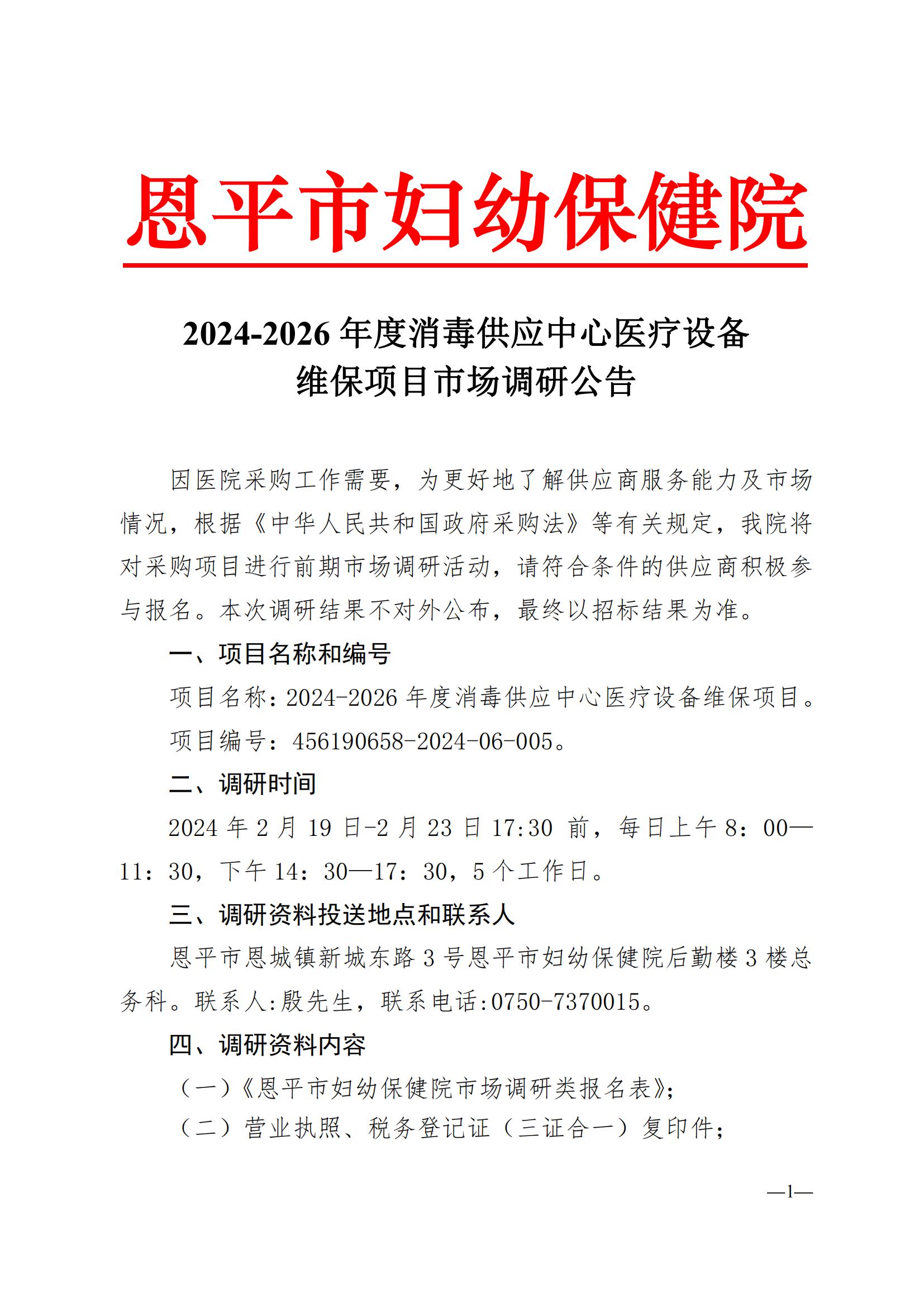 2024-2026年度消毒供应中心医疗设备维保项目采购市场调研公告(编号:456190658-2024-05-006)