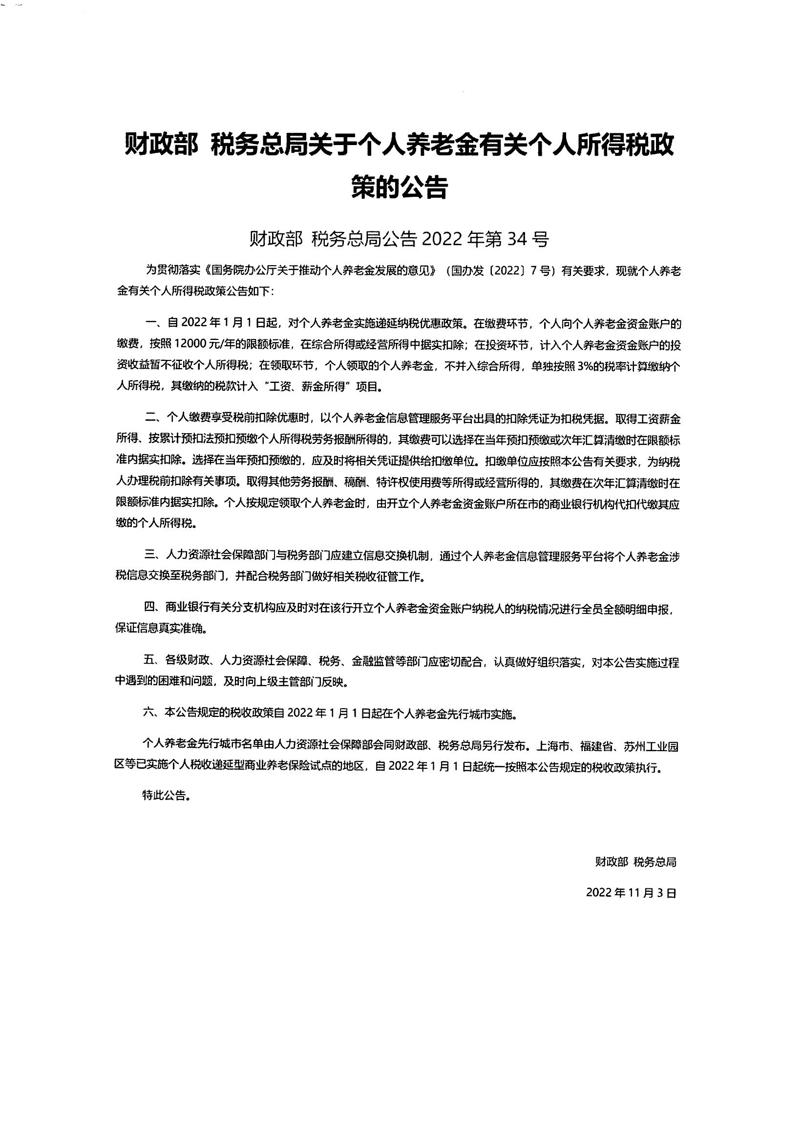 关于个人养老金有关个人所得税政策的公告 财政部 税务总局公告2022年第34号