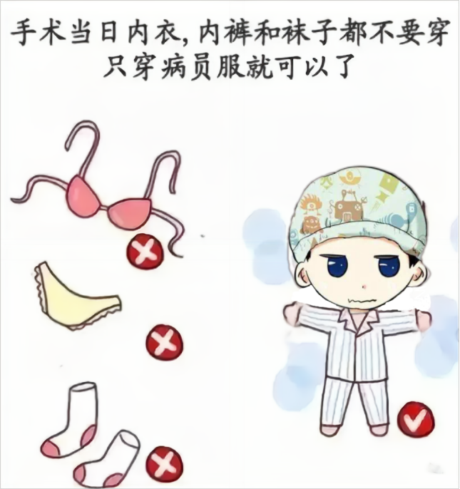 请您穿好病号服(不穿内衣裤,必要时上衣需反穿),看看手腕带是否佩戴,这个可是进入手术室的通行证哦,准备好后请您在病房等待病区护士送您到手术室。