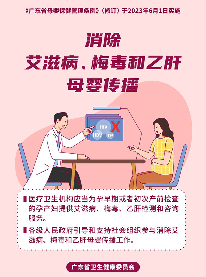为预防、控制艾滋病等重大传染病对妇女儿童健康的威胁,及时阻断重大传染病的母婴传播,《条例》第九条规定,医疗卫生机构应当为孕产妇提供艾滋病、梅毒、乙肝等重大传染病的检测、咨询服务及干预治疗。
