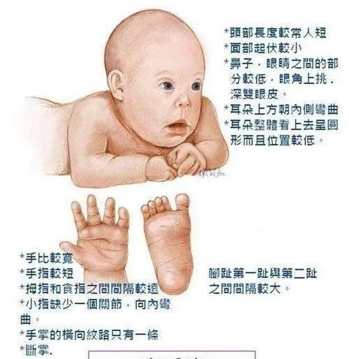 1、特殊面容:眼距宽,眼裂小,鼻根低平,舌胖,常伸出口外。流涎多。身材矮小,四肢短,由于韧带松弛,关节可过度弯曲,手指粗短,常见通贯掌纹、草鞋足,拇趾球部约半数患儿呈弓形皮纹。