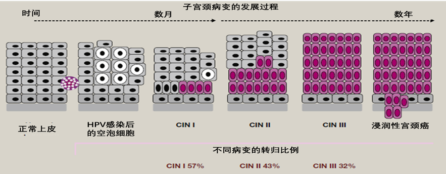 80%的成年人在一生中都感染过HPV。但大多数HPV感染是短暂的,会在12-24个月内清除,约2-5%女性(多为30岁以上)会发生HPV持续感染,持续感染可能会导致从1-3级CIN(宫颈上皮内瘤变)到浸润性宫颈癌的发生,这一过程通常需要10-15年。
