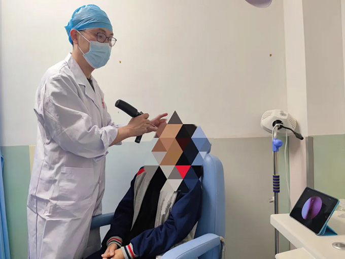 (江门市妇幼保健院眼耳鼻喉科负责人李健忠为患者看诊)