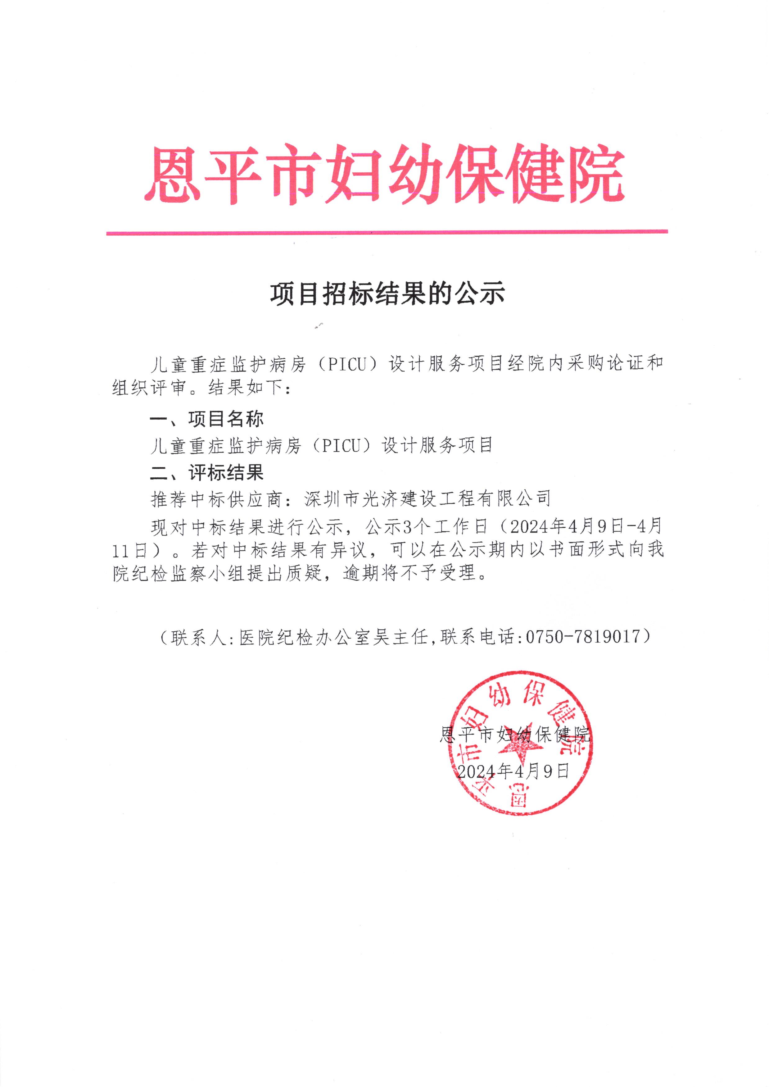 儿童重症监护病房(PICU)设计服务项目招标结果公示(编号:456190658-2024-01-011)