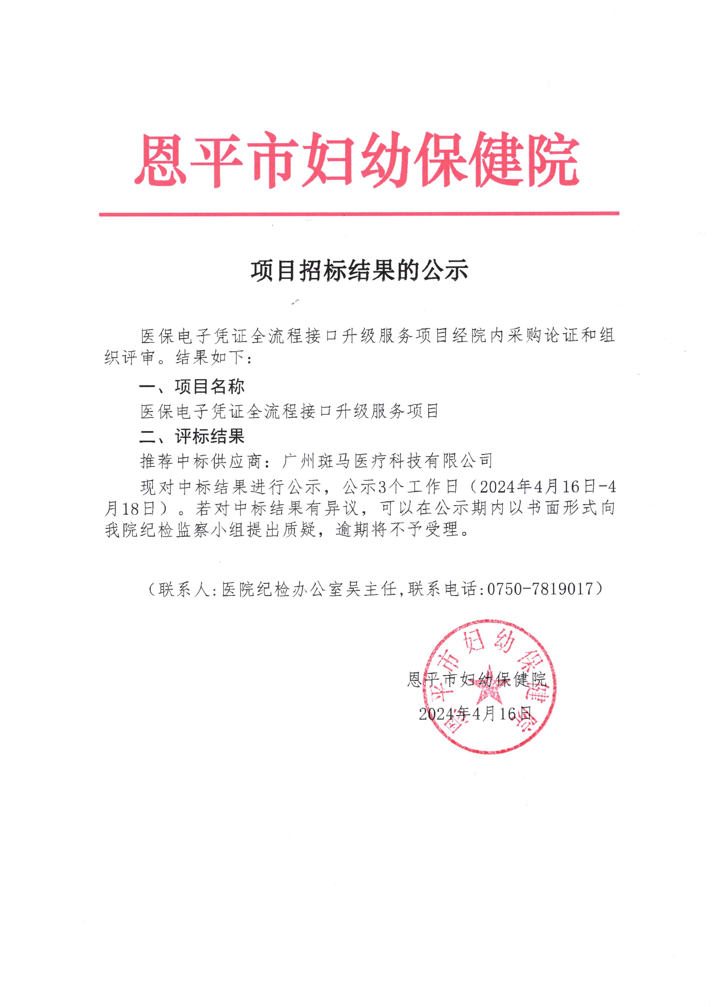 医保电子凭证全流程接口升级服务项目招标结果公示(编号:456190658-2024-04-009)