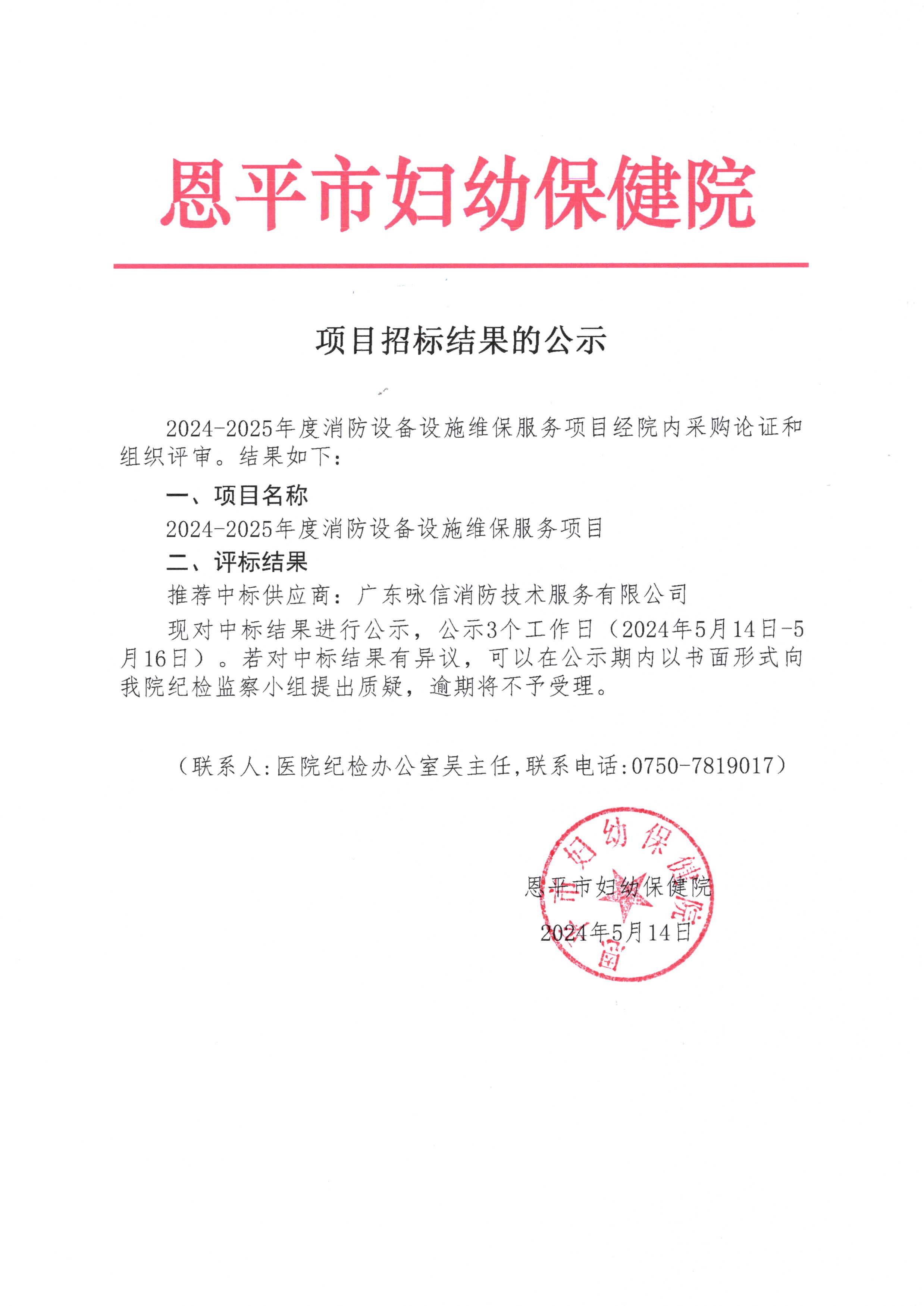 2024-2025年度消防设备设施维保服务项目招标结果公示(编号:456190658-2024-05-008)