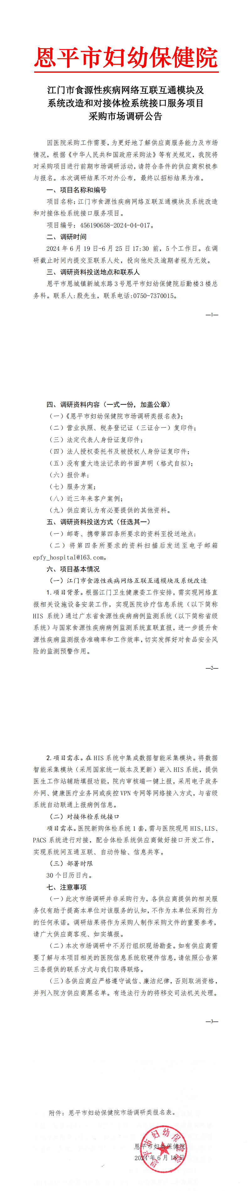 江门市食源性疾病网络互联互通模块及系统改造和对接体检系统接口服务项目采购市场调研公告(编号:456190658-2024-04-017)