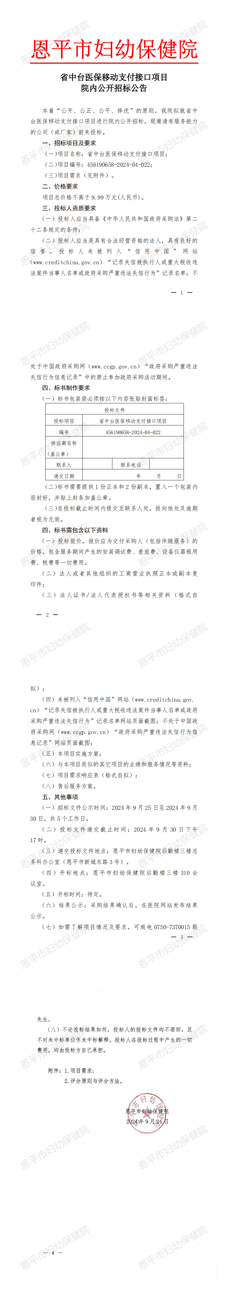 省中台医保移动支付接口项目院内招标公告(编号:456190658-2024-04-022)