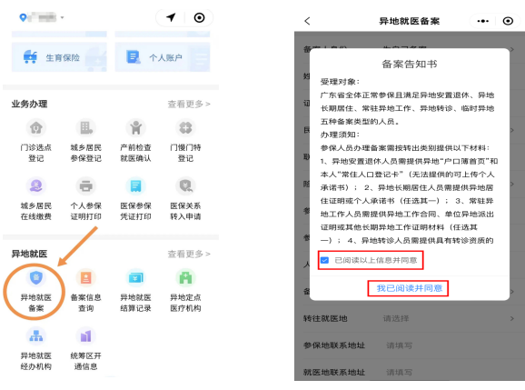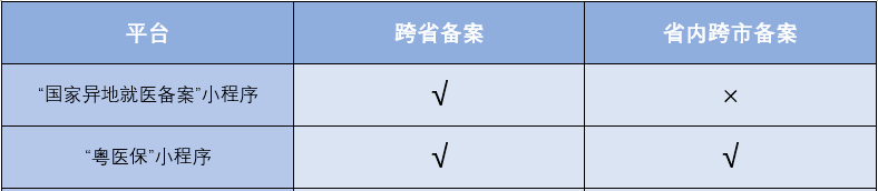 参保人可通过“国务院客户端”小程序“跨省异地就医备案”服务页面,或“国家异地就医备案”小程序、“粤医保”小程序快速办理异地就医备案!其中: