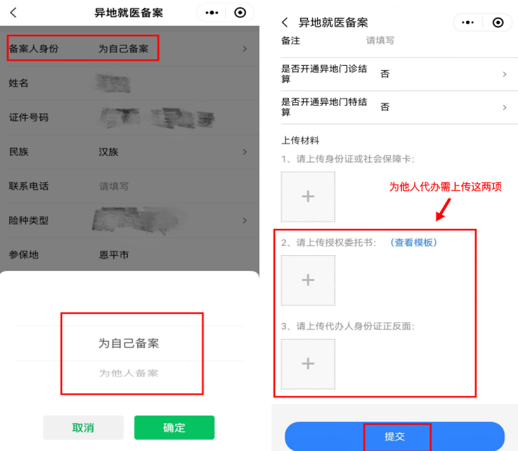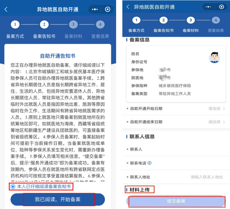 阅读备案告知书,开始进行异地备案,首先核对备案信息,选择申请备案开始时间,填写联系人信息,根据备案人员的不同类别,上传相应的备案证明材料,例如居民身份证、转诊转院证明材料、居住证、工作合同等。