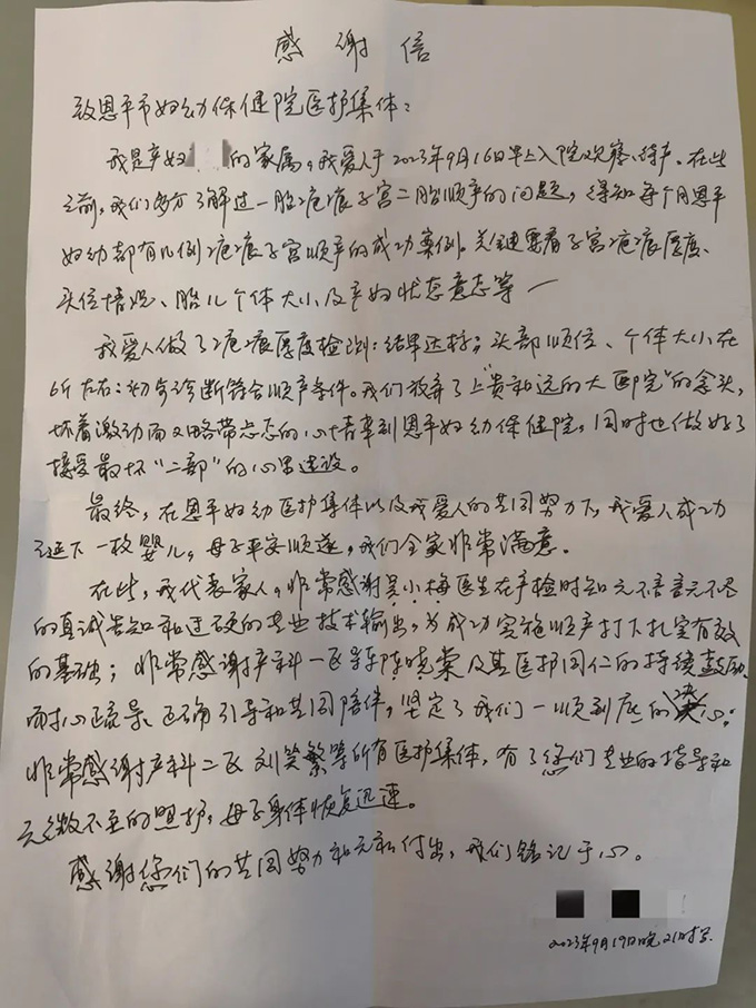 在此,我代表家人,非常感谢吴小梅医生在产检时知无不言言无不尽的真诚告知和过硬的专业技术输出,为成功实施顺产打下扎实有效的基础;非常感谢产科一区导乐陈晓棠及其医护同仁的持续鼓励、耐心疏导、正确引导和共同陪伴,坚定了我们一顺到底的决心;非常感谢产科二区刘笑繁等所有医护集体,有了您们的专业指导和无微不至的招呼,母子身体恢复迅速。