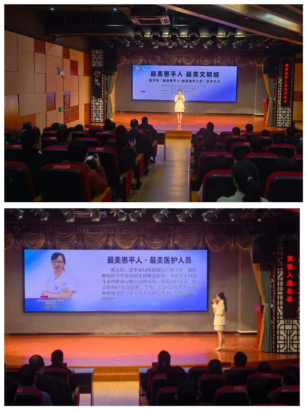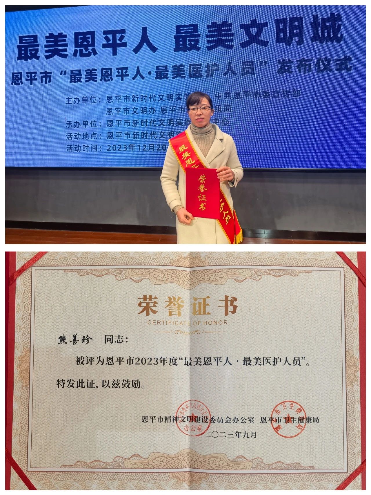 12月20日上午,2023年”最美恩平人▪最美医护人员”发布仪式在恩平市新时代文明实践中心举行,我院产科主任熊善珍在评选中获得“最美医护人员”称号!