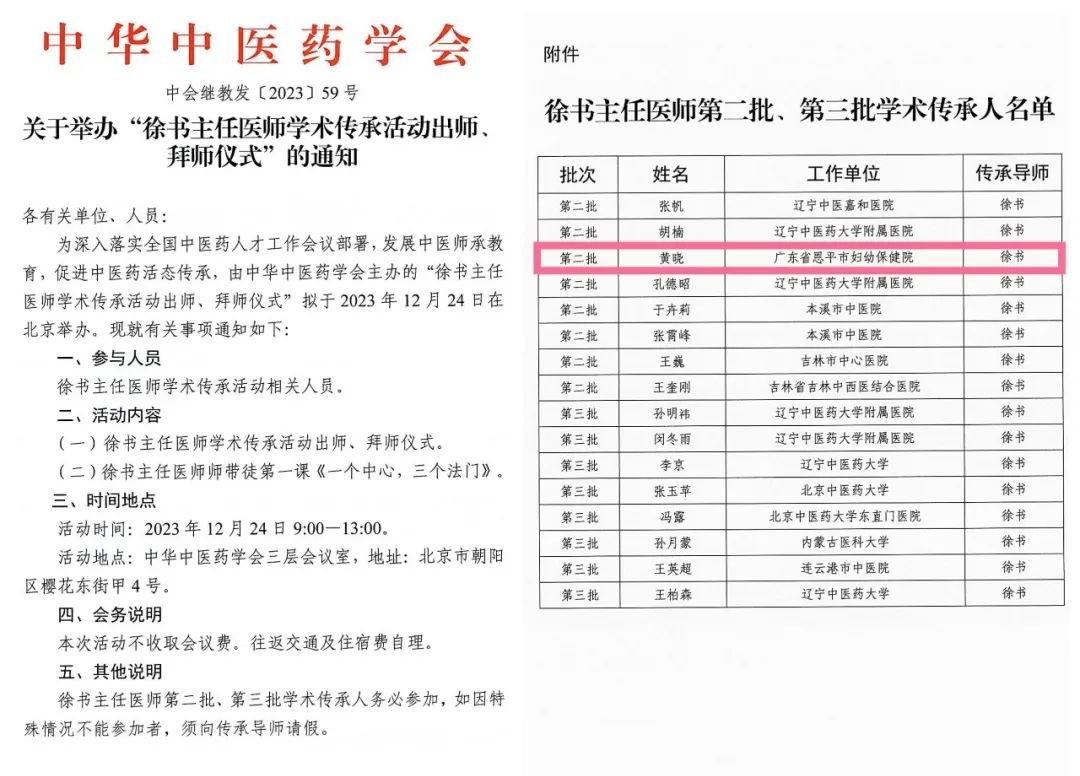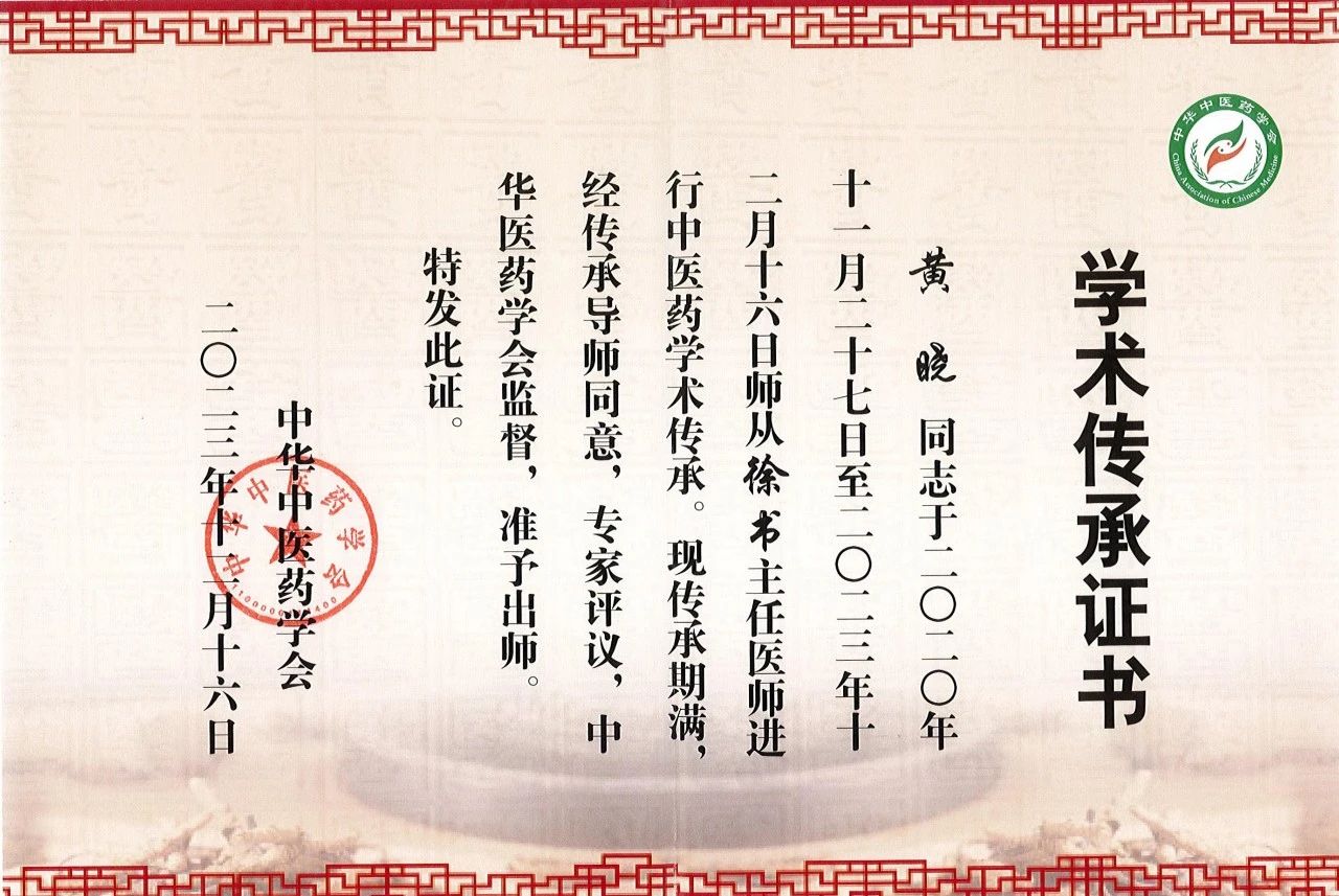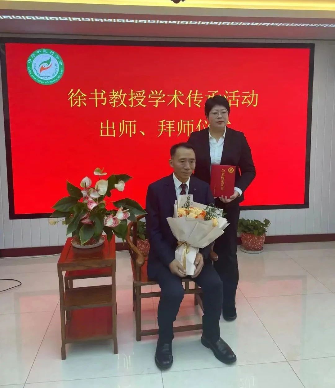 2023年12月24日,“徐书教授学术传承出师、拜师仪式”在北京中华中医药学会三楼会议室隆重举行。我院黄晓主任经过2年多的努力,在徐书教授耳提面命教导之下,跟师学习、勤奋自学,在继承徐书教授学术思想和临床经验的基础上有所创见,在理论研究和临床实践等方面均有提高。现学习期满,考核通过,根据《中华中医药学会学术传承活动管理暂行办法》,准予出师。