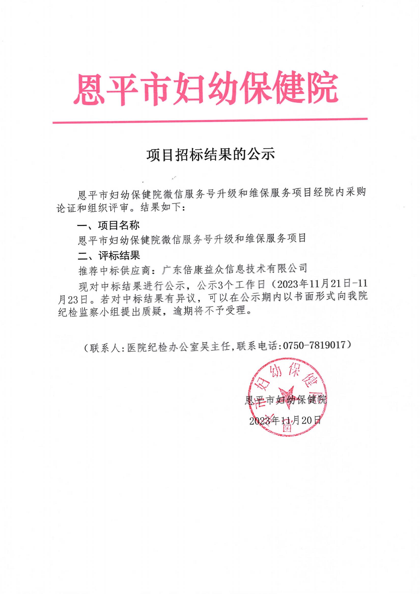 恩平市妇幼保健院微信服务号升级和维保服务项目招标结果公示