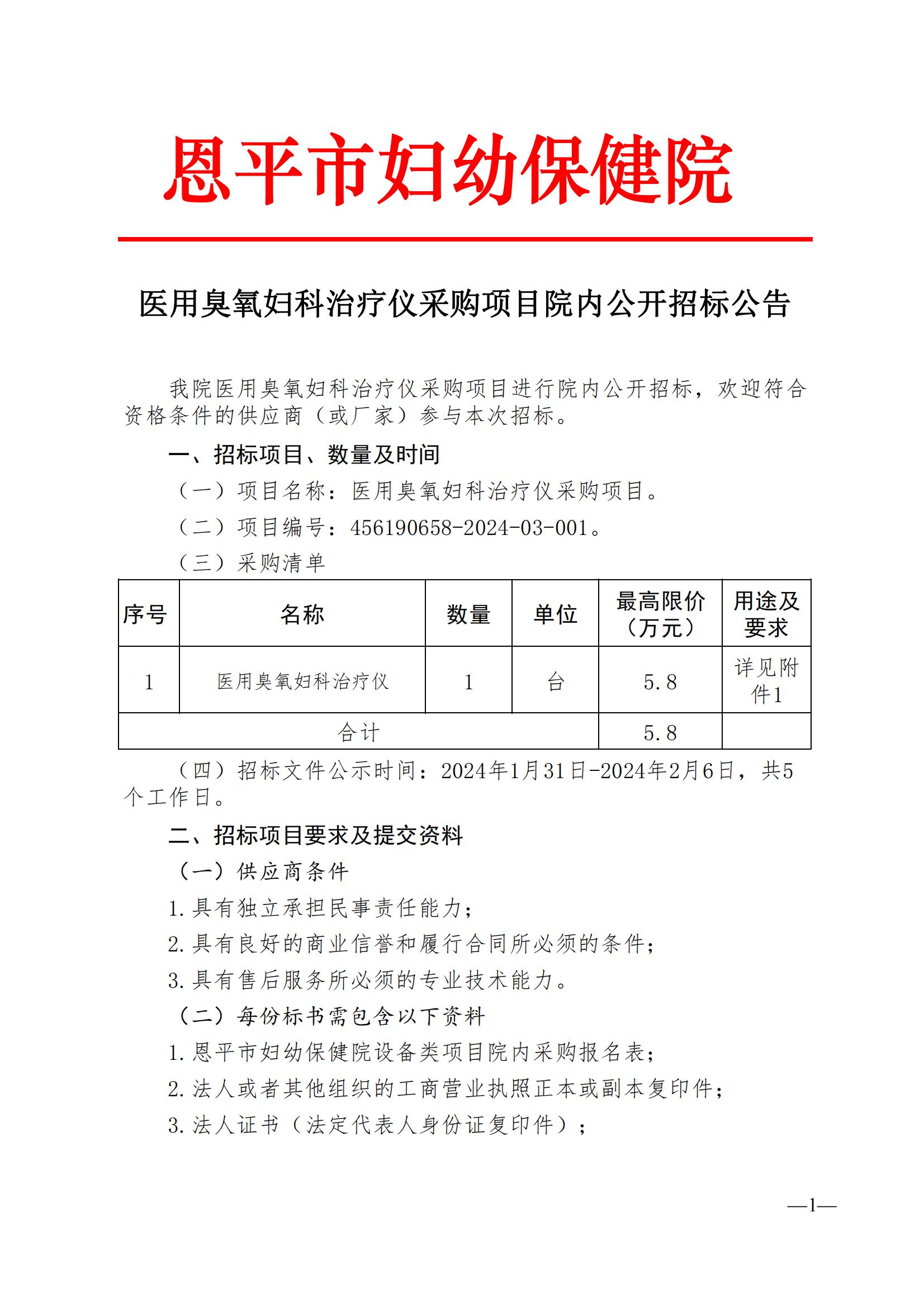 医用臭氧妇科治疗仪采购项目院内公开招标公告(编号:456190658-2024-03-001)