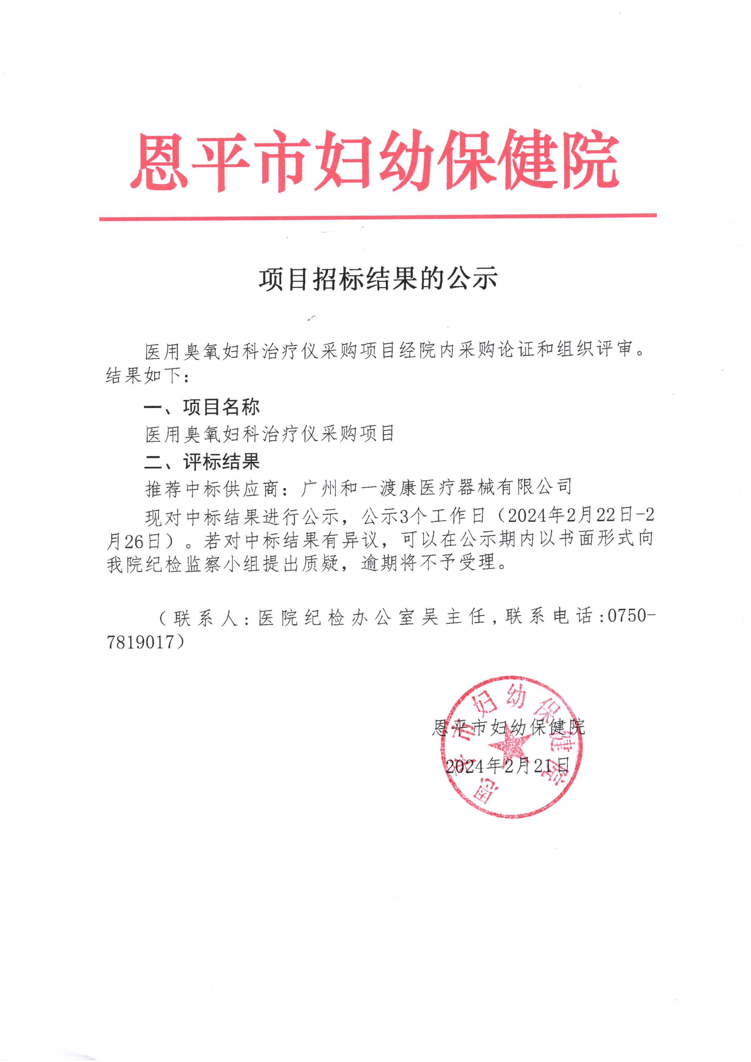 医用臭氧妇科治疗仪采购项目采购结果公示(编号:456190658-2024-03-001)
