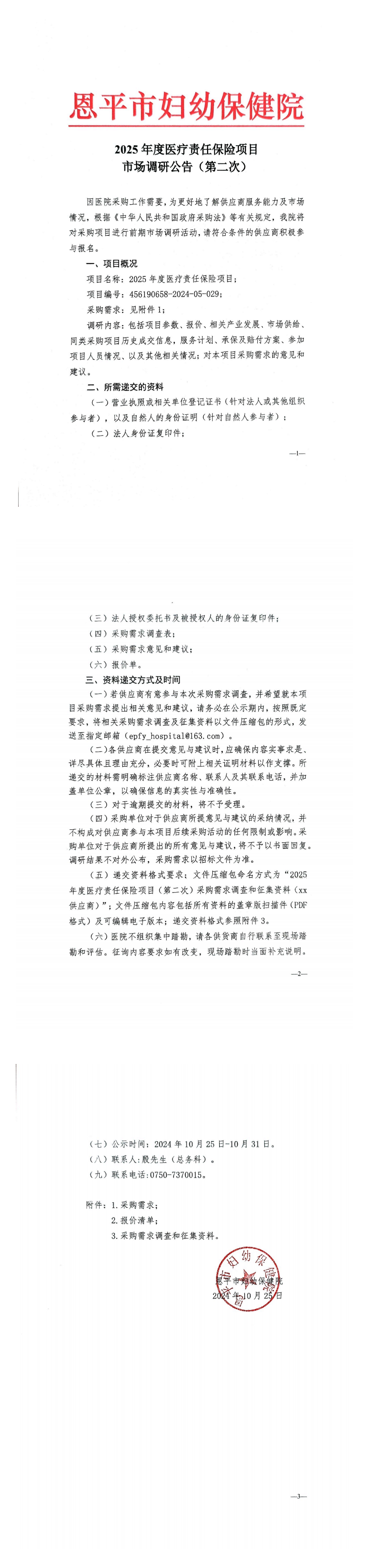 2025年度医疗责任保险项目 市场调研公告(第二次)(编号:456190658-2024-05-029)