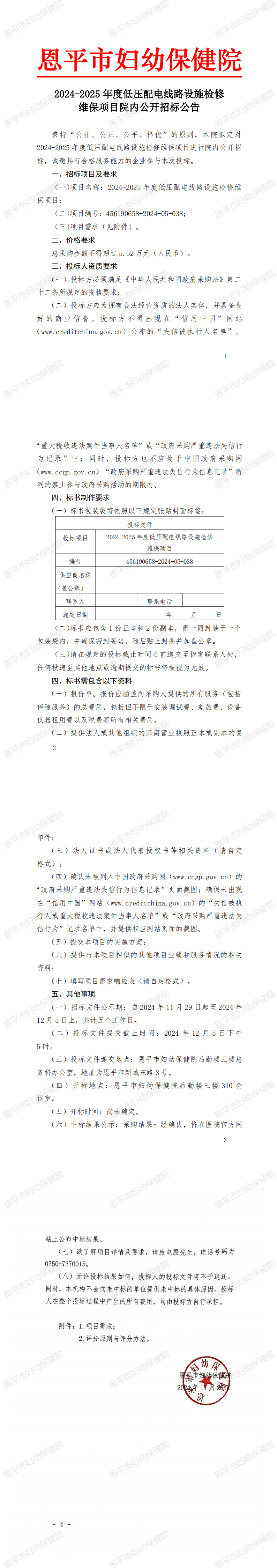 2024-2025 年度低压配电线路设施检修维保项目院内公开招标公告(编号:456190658-2024-05-038)