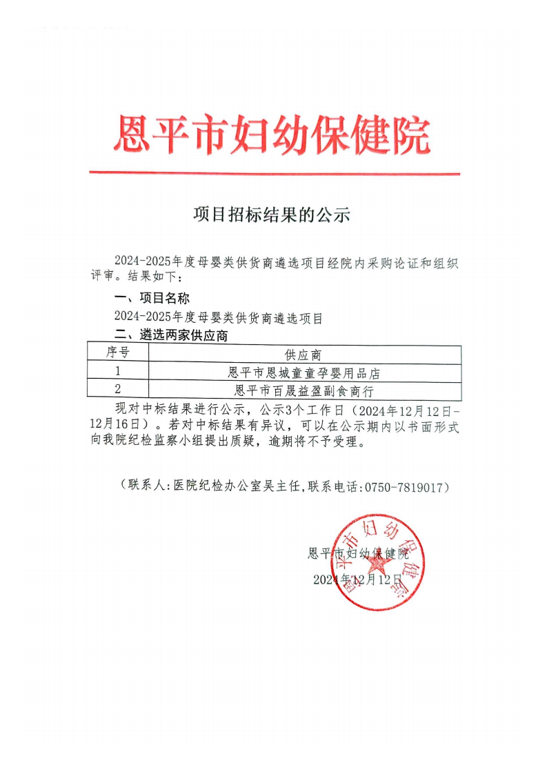 2024-2025年度母婴类供货商遴选项目招标结果公示(编号:456190658-2024-05-034)