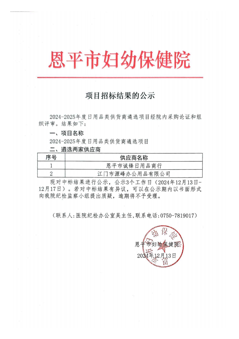2024-2025 年度日用品供货商遴选项目招标结果公示(编号:456190658-2024-05-032)
