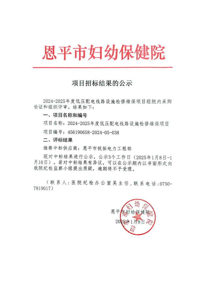 2024-2025 年度低压配电线路设施检修维保项目招标结果公示(编号:456190658-2024-05-038)