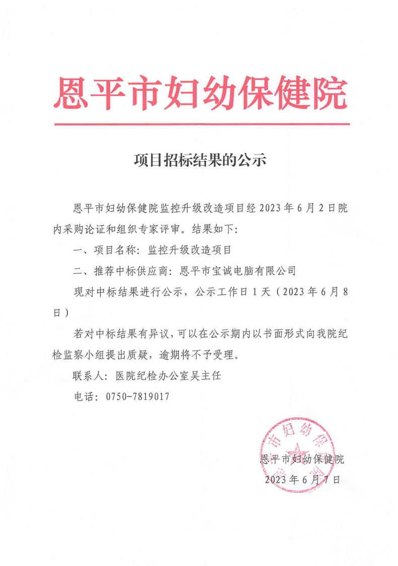 恩平市妇幼保健院监控系统升级改造项目招标结果公示