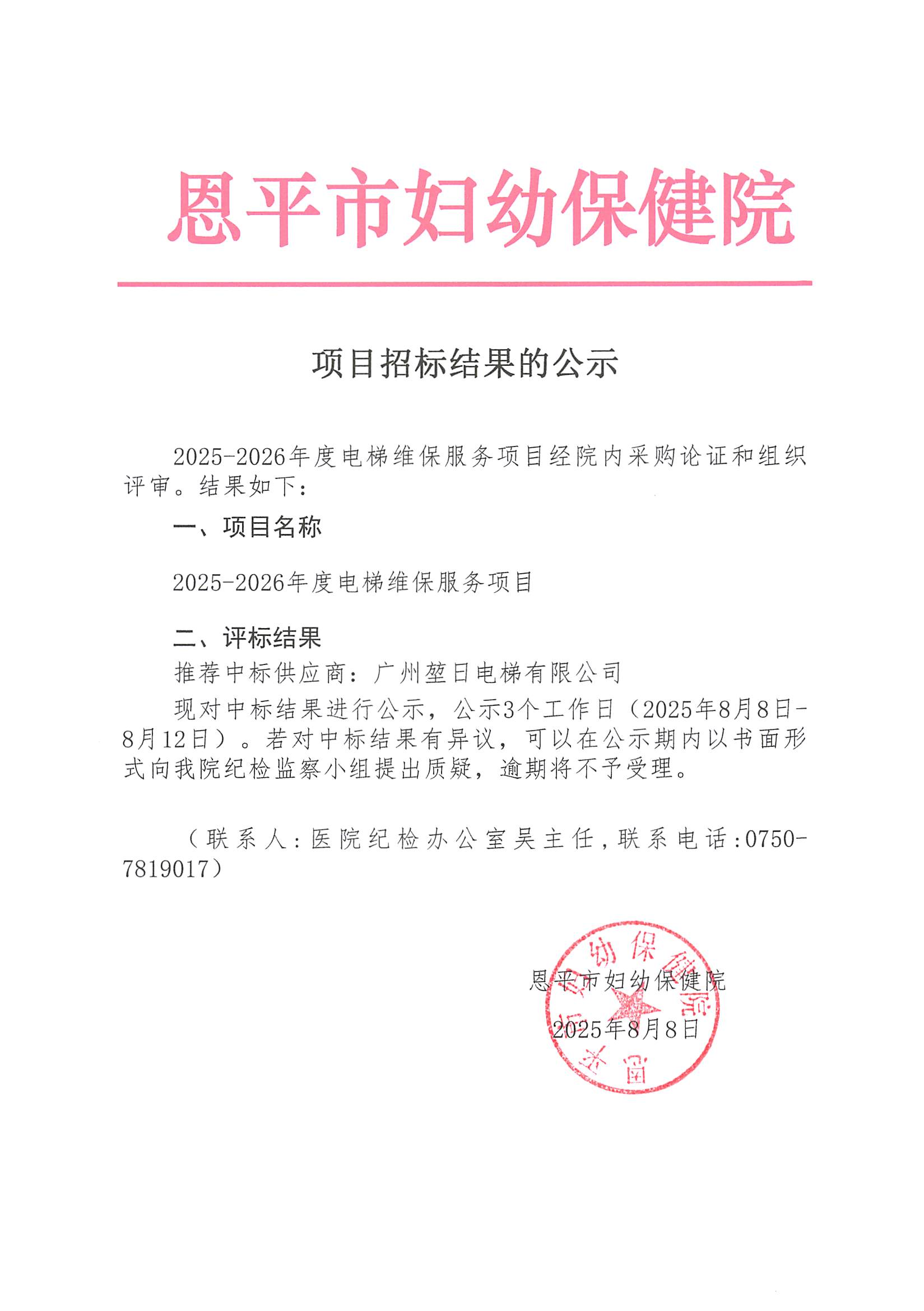 2025-2026年度电梯维保服务项目招标结果的公示(编号:456190658-2025-05-009)