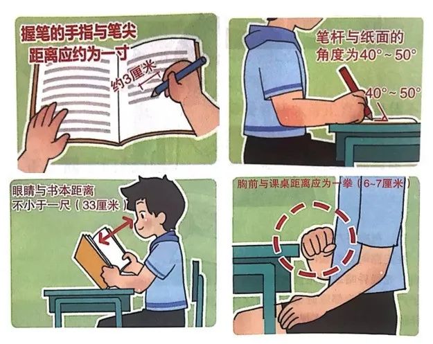 坚持“三个一”,即眼睛离书本一尺,胸口离桌沿一拳,握笔的手指离笔芯一寸,读写连续用眼时间不宜超过40分钟。