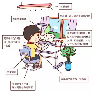 养成良好用眼习惯。不在走路、吃饭、卧床和晃动的车厢内、光线暗弱或阳光直射等情况下看书或使用电子产品,写作业、读书时应保持良好读写姿势,即眼睛与书本距离应约为一尺、胸前与课桌距离应约为一拳、握笔的手指与笔尖应约为一寸。同时,读写连续用眼时间不宜超过40分钟。