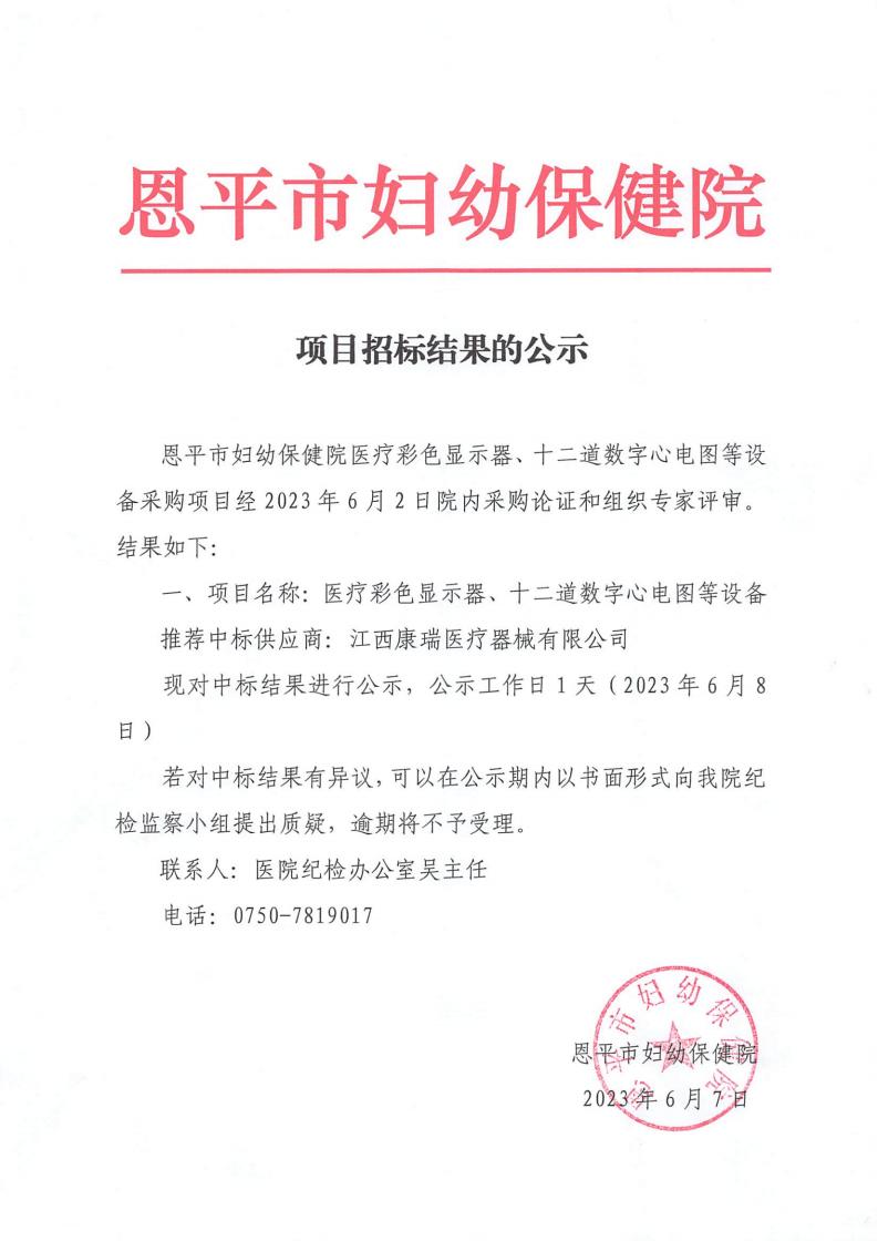 采购结果公示(医疗彩色显示器、十二道数字心电图等设备)