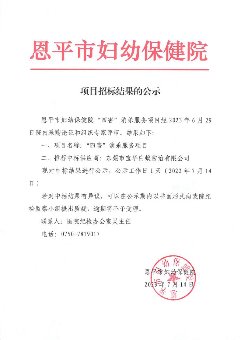 采购结果公示(“四害”消杀服务)