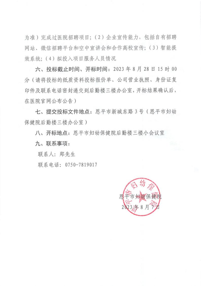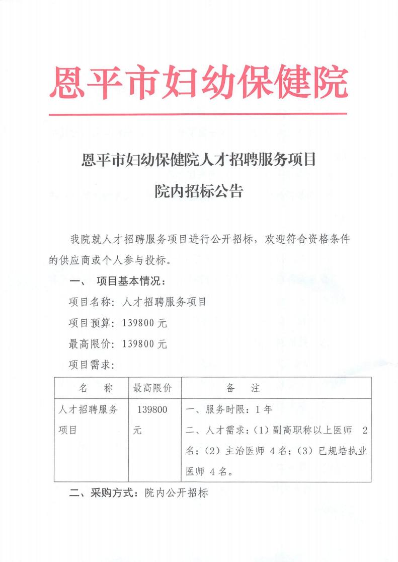 恩平市妇幼保健院人才招聘服务项目院内招标公告