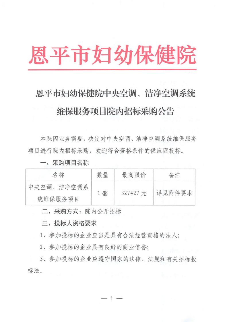 恩平市妇幼保健院中央空调、洁净空调系统维保服务项目院内招标公告