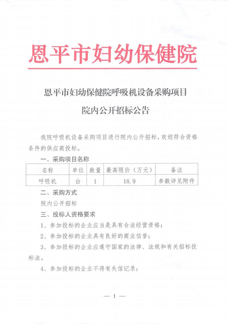 恩平市妇幼保健院呼吸机设备采购项目院内公开招标公告