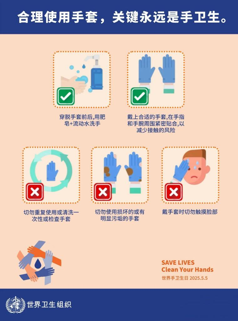 2025年5月5日是第17个世界手卫生日。今年主题是:“合理使用手套,关键永远是手卫生。”不仅提醒手套合理使用,更强调了一双清洁的手是预防疾病最简单、有效的方法。无论是日常生活中,还是在医疗环境中,正确洗手都能有效阻断细菌、病毒的传播保护自己和他人的健康。