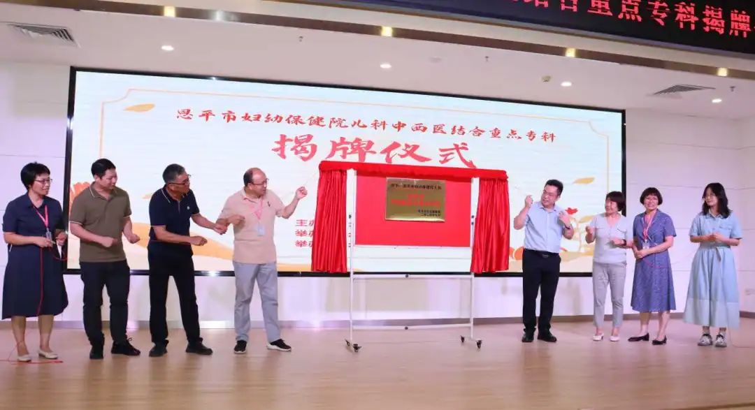 揭牌仪式上,市卫生健康局蒋蔚昱书记、张坚强副局长、朱运鹏股长、方晔股长,我院吴健嫦院长、岑婷副院长、孙丽梅主任、郭金岗主任上台揭牌。在热烈的掌声中,恩平市妇幼保健院儿科中西医结合重点专科正式揭牌。